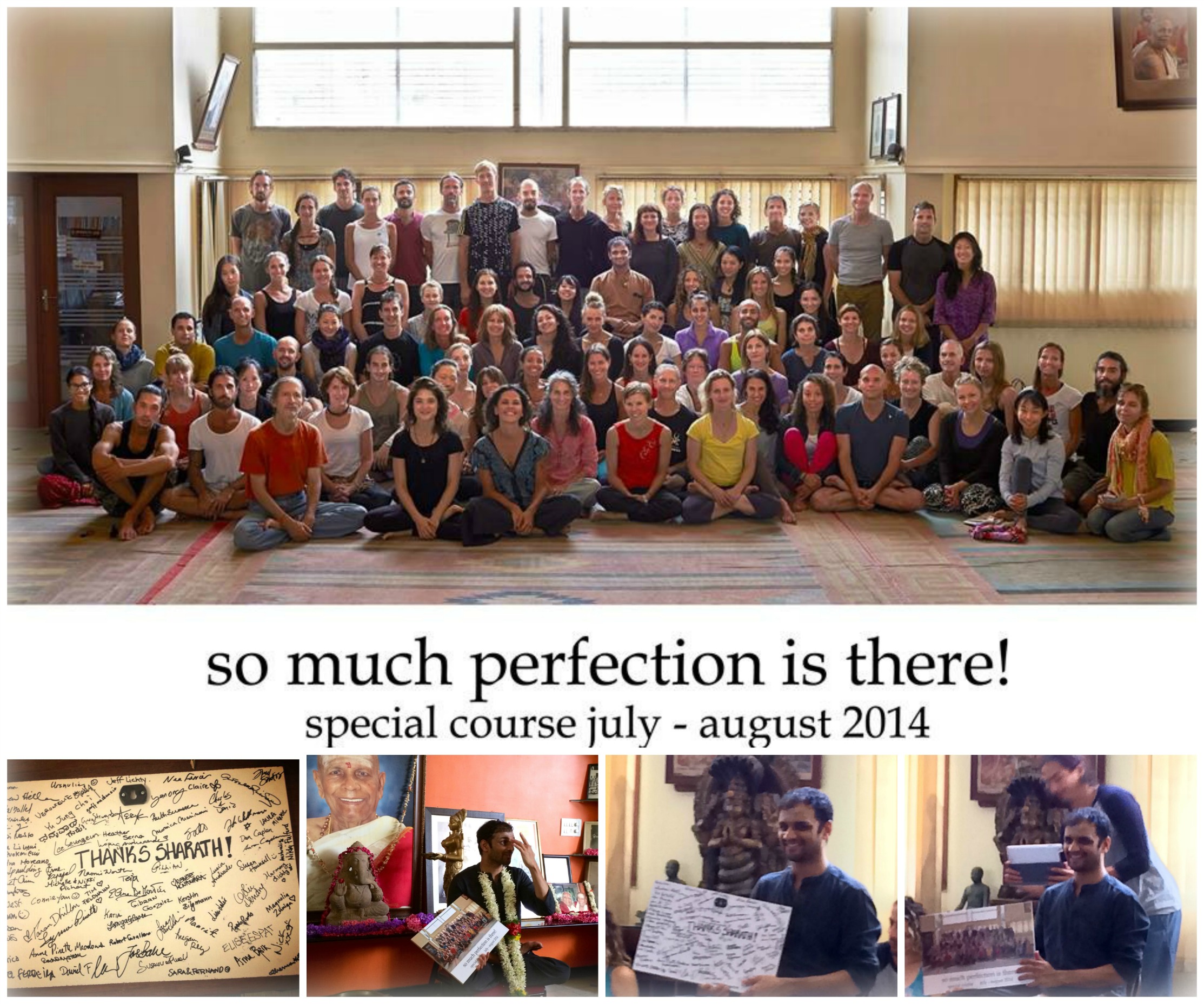 這次的課程開放給所有符合資格的導師申請報名。錄取大概百分之四十左右的報名者。以今時今日要來Mysore朝聖的難度指標相比,這回全體約一百人的課程,算是超幸福的“小班制”了。除了沒有新生,沒有初學者以外,與會者的體位程度卻是有小小“爆燈”的嫌疑,接近百分之六十的同學已進階三級;大部份的同學都是來了10-15次的資深練習者、最少的是第三次,最多的是第二十五次!其他各方面的樣本比例倒是跟普通季節差不多,年齡層也跟平常時候一般,介於二八到七二之間。國籍比例也跟Ashtanga的國際滲透演變史吻合。放眼皆是金髮碧眼的白種人;有南、北美、有東、西歐再加少部分的亞裔人士。令人訝異的是沒有日本人也沒有台灣人。同學發現我是住日本的華人,都跑來問我為甚麼。我倒真的是一問三不知!